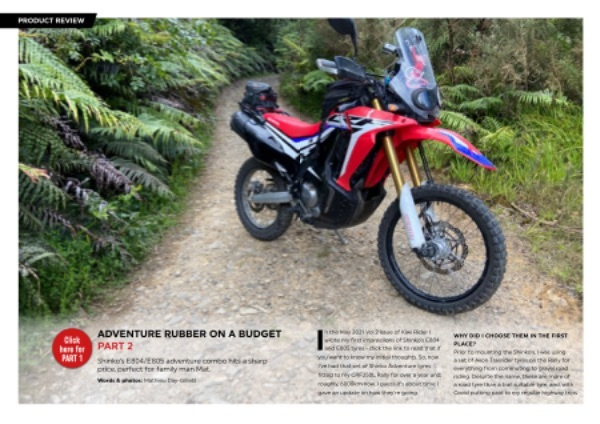 In the May 2021 Vol . 2 issue of Kiwi Rider I wrote my first impressions of Shinko ’ s E804 and E805 tyres - click the link to read that if you want to know my initial thoughts . So , now I ’ ve had that set of Shinko Adventure tyres fitted to my CRF250L Rally for over a year and , roughly , 6000km now . I guess it ’ s about time I gave an update on how they ’ re going .