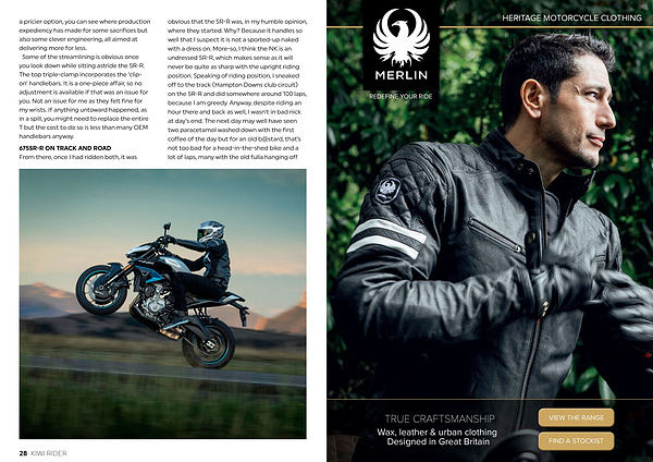 obvious that the SR-R was, in my humble opinion, where they started. Why? Because it handles so well that I suspect it is not a sported-up naked with a dress on. More-so, I think the NK is an undressed SR-R, which makes sense as it will never be quite as sharp with the upright riding position. Speaking of riding position, I sneaked off to the track( Hampton Downs club circuit) on the SR-R and did somewhere around 100 laps, because I am greedy. Anyway, despite riding an hour there and back as well, I wasn’ t in bad nick at day’ s end. The next day may well have seen two paracetamol washed down with the first coffee of the day but for an old b @ stard, that’ s not too bad for a head-in-the-shed bike and a lot of laps, many with the old fulla hanging off