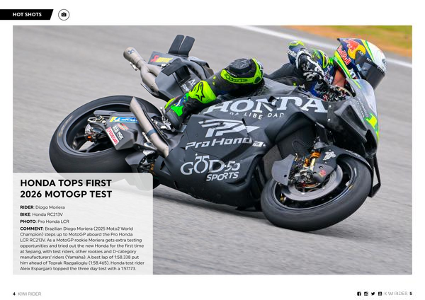 RIDER: Diogo Moriera BIKE: Honda RC213V PHOTO: Pro Honda LCR COMMENT: Brazilian Diogo Moriera( 2025 Moto2 World Champion) steps up to MotoGP aboard the Pro Honda LCR RC213V. As a MotoGP rookie Moriera gets extra testing opportunities and tried out the new Honda for the first time at Sepang, with test riders, other rookies and D-category manufacturers’ riders( Yamaha). A best lap of 1:58.338 put him ahead of Toprak Razgalioglu( 1:58.465). Honda test rider Aleix Espargaro topped the three day test with a 1:57.173.