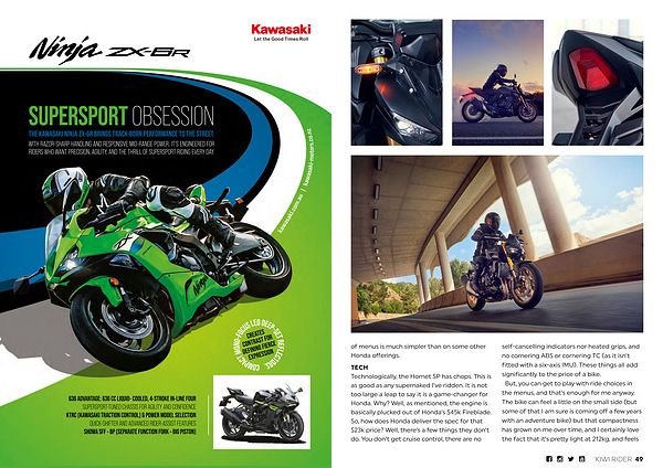 WITH RAZOR-SHARP HANDLING AND RESPONSIVE MID-RANGE POWER, IT’ S ENGINEERED FOR RIDERS WHO WANT PRECISION, AGILITY, AND THE THRILL OF SUPERSPORT RIDING EVERY DAY. kawasaki-motors. co. nz kawasaki. com. au |