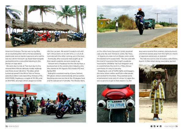 on the other hand, favoured t-shirts, baseball caps and, the ever trendy on a bike, flip-flops. In Nigeria, any bike not an Okada came under the blanket term‘ power bike’. This was said with the kind of reverence that might usually be reserved for 2000bhp Top Fuel dragsters and, in a world where the norm is a 10hp chinese commuter, it’ s easy to see why. Stopping at a set of traffic lights and beggars, the lame, street-sellers and Police alike would get excited for the bikes. They wanted some entertainment and a bit of a show. In Lagos this was as good as it got in that respect. So, the