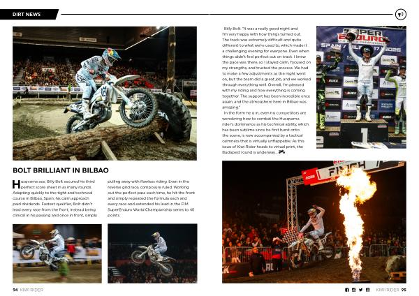 Billy Bolt:“ It was a really good night and I’ m very happy with how things turned out. The track was extremely difficult and quite different to what we’ re used to, which made it a challenging evening for everyone. Even when things didn’ t feel perfect out on track, I knew the pace was there, so I stayed calm, focused on my strengths, and trusted the process. We had to make a few adjustments as the night went on, but the team did a great job, and we worked through everything well. Overall, I’ m pleased with my riding and how everything is coming together. The support has been incredible once again, and the atmosphere here in Bilbao was amazing.” In the form he is in, even his competitors are wondering how to combat the Husqvarna rider’ s dominance as his technical ability, which has been sublime since he first burst onto the scene, is now accompanied by a tactical calmness that is virtually unflappable. As this issue of Kiwi Rider heads to virtual print, the Budapest round is underway …