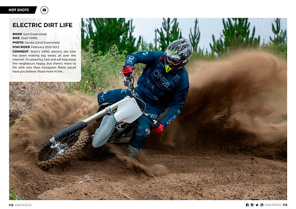 RIDER: Sam Greenslade BIKE: Stark VARG PHOTO: Sandia Zand Greenslade KIWI RIDER: February 2026 Vol. 2 COMMENT: Stark’ s VARG electric dirt bike has been making big waves all over the internet. It’ s powerful, fast and will help keep the neighbours happy, but there’ s more to life with one than Instagram Reels would have you believe. Read more in link...
