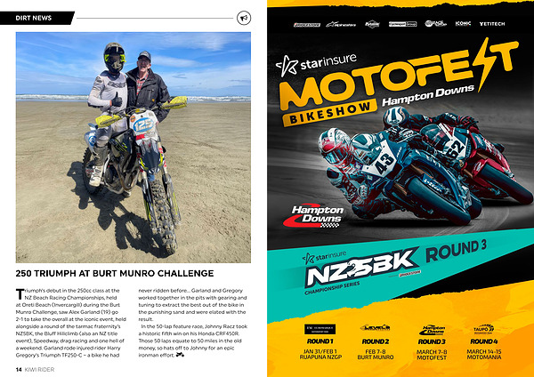 NZ Beach Racing Championships, held at Oreti Beach( Invercargill) during the Burt Munro Challenge, saw Alex Garland( 19) go 2-1 to take the overall at the iconic event, held alongside a round of the tarmac fraternity’ s NZSBK, the Bluff Hillclimb( also an NZ title event), Speedway, drag racing and one hell of a weekend. Garland rode injured rider Harry Gregory’ s Triumph TF250-C – a bike he had never ridden before... Garland and Gregory worked together in the pits with gearing and tuning to extract the best out of the bike in the punishing sand and were elated with the result. In the 50-lap feature race, Johnny Racz took a historic fifth win on his Honda CRF450R. Those 50 laps equate to 50 miles in the old money, so hats off to Johnny for an epic ironman effort.