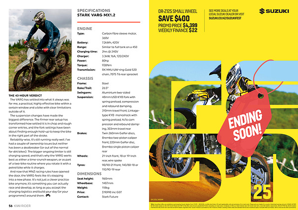 T & Cs: Suzukifest offers are available at participating Suzuki dealers from 1 / 11 / 25 – 28 / 02 / 26, or while stock lasts. All road registerable units are exclusive of on-road costs. Please ask your dealer for a quote. Advertised savings amount of $ 400 off RRP. $ 21.98 / week based on DR-Z125 Small Wheel with RRP of $ 4,399, total amount payable $ 5,714.80, excluding on-road costs, nil deposit, 6.75 % p. a. fixed interest rate, 60-month loan term, total 260 weekly repayments, $ 10.35 PPSR fee, $ 0.50 weekly maintenance fee, $ 130 UDC loan fee and $ 200 dealer origination fee. Suzuki Finance is provided by UDC Finance Limited. Lending criteria, fees and standard terms and conditions apply. Excludes fleet purchases, demo units and all other promotions.