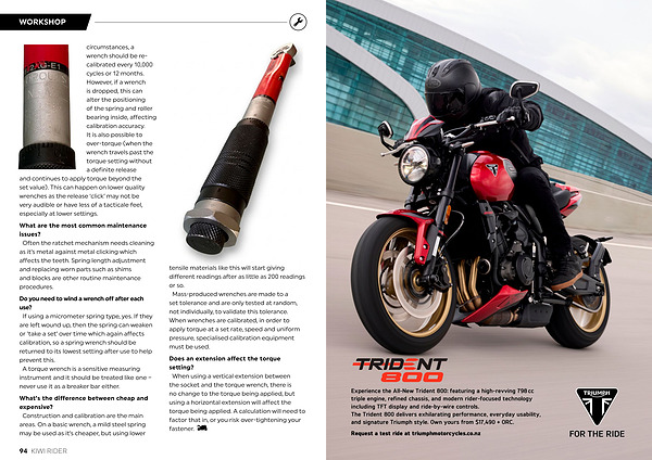 WORKSHOP circumstances, a wrench should be recalibrated every 10,000 cycles or 12 months. However, if a wrench is dropped, this can alter the positioning of the spring and roller bearing inside, affecting calibration accuracy. It is also possible to over-torque( when the wrench travels past the torque setting without a definite release and continues to apply torque beyond the set value). This can happen on lower quality wrenches as the release‘ click’ may not be very audible or have less of a tacticale feel, especially at lower settings.