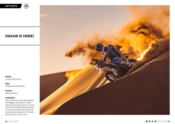 COMMENT : With stunning visuals guaranteed , the biggest rally show on earth rolls into life at the start of January . 2023 FIM World Rally-Raid champ Luciano Benavides ( pictured ) will be looking to improve on his sixth position in last year ’ s race .