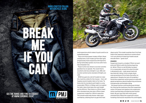and responsive which makes it quick and fun on sealed backroads . There are three power modes of Rain , Road and Dynamic . Each mode up from Rain gets progressively more responsive with Dynamic being noticeably quicker at all revs with more top end power too . Power to the rear wheel is via chain and the gearbox has six speeds . The clutch feel is excellent and nice and light in use . ABS and traction control come standard . All lights are LED . BMW has gone to a lot of trouble to make this machine a bike for the masses – that will happily accommodate riders of all sizes . To that end , the standard seat height is a very reasonable 790mm . A Rallye seat is an option for taller riders that takes the seat height up the 845mm . Then there is a 25mm lower than standard seat , but also a 25mm lower suspension model for a 50mm reduction . This should really help shorter riders gain confidence , allowing them to get their feet