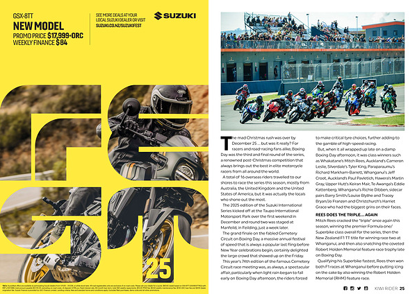 The mad Christmas rush was over by December 25... but was it really? For racers and road-racing fans alike, Boxing Day was the third and final round of the series, a renowned post-Christmas competition that always brings out the best in elite motorcycle racers from all around the world. A total of 16 overseas riders travelled to our shores to race the series this season, mostly from Australia, the United Kingdom and the United States of America, but it was actually the locals who shone out the most. The 2025 edition of the Suzuki International Series kicked off at the Taupo International Motorsport Park over the first weekend in December and round two was staged at Manfeild, in Feilding, just a week later. The grand finale on the fabled Cemetery Circuit on Boxing Day, a massive annual festival of speed that is always a popular last fling before New Year celebrations begin, certainly delighted the large crowd that showed up on the Friday. This year’ s 74th edition of the famous Cemetery Circuit race meeting was, as always, a spectacular affair, particularly when light rain began to fall early on Boxing Day afternoon, the riders forced