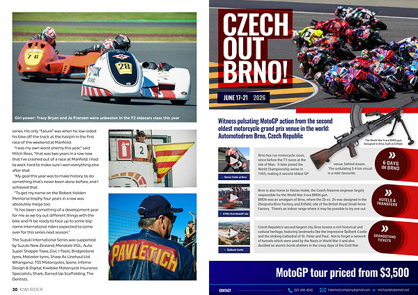 series. His only“ failure” was when he low-sided his bike off the track at the hairpin in the first race of the weekend at Manfeild.“ I was my own worst enemy this year,” said Mitch Rees,“ that was two years in a row now that I’ ve crashed out of a race at Manfeild. I had to work hard to make sure I won everything else after that.“ My goal this year was to make history, to do something that’ s never been done before, and I achieved that.“ To get my name on the Robert Holden Memorial trophy four years in a row was absolutely mega too.“ It has been something of a development year for me as we try out different things with the bike and I’ ll be ready to face up to some bigname international riders expected to come over for this series next season.”