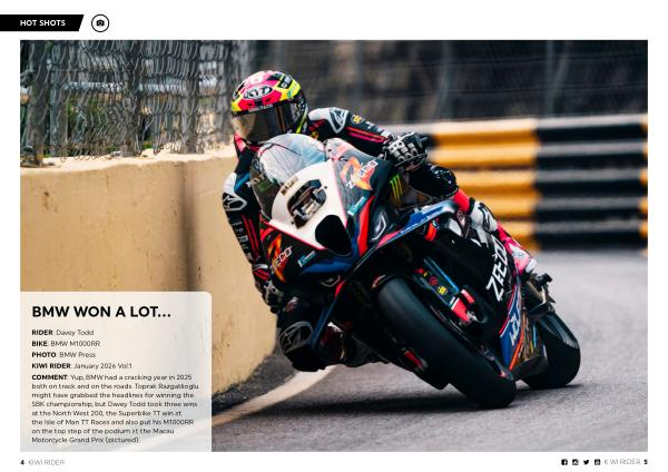 RIDER: Davey Todd BIKE: BMW M1000RR PHOTO: BMW Press KIWI RIDER: January 2026 Vol. 1 COMMENT: Yup, BMW had a cracking year in 2025 both on track and on the roads. Toprak Razgatlioglu might have grabbed the headlines for winning the SBK championship, but Davey Todd took three wins at the North West 200, the Superbike TT win at the Isle of Man TT Races and also put his M1000RR on the top step of the podium at the Macau Motorcycle Grand Prix( pictured).