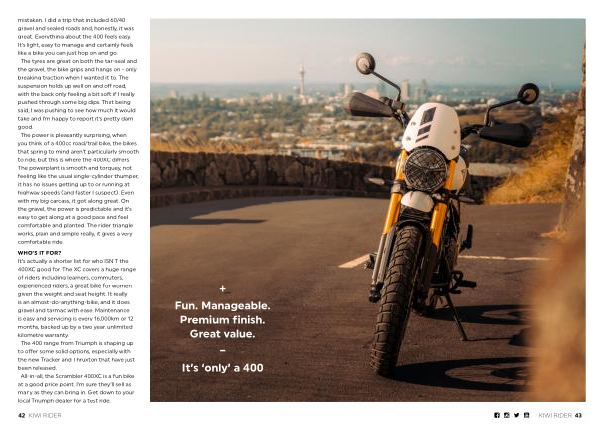 mistaken. I did a trip that included 60 / 40 gravel and sealed roads and, honestly, it was great. Everything about the 400 feels easy. It’ s light, easy to manage and certainly feels like a bike you can just hop on and go. The tyres are great on both the tar-seal and the gravel, the bike grips and hangs on- only breaking traction when I wanted it to. The suspension holds up well on and off road, with the back only feeling a bit soft if I really pushed through some big dips. That being said, I was pushing to see how much it would take and I’ m happy to report it’ s pretty darn good. The power is pleasantly surprising, when you think of a 400cc road / trail bike, the bikes that spring to mind aren’ t particularly smooth to ride, but this is where the 400XC differs. The powerplant is smooth and torquey, not feeling like the usual single-cylinder thumper, it has no issues getting up to or running at highway speeds( and faster I suspect). Even with my big carcass, it got along great. On the gravel, the power is predictable and it’ s easy to get along at a good pace and feel comfortable and planted. The rider triangle works, plain and simple really, it gives a very comfortable ride.