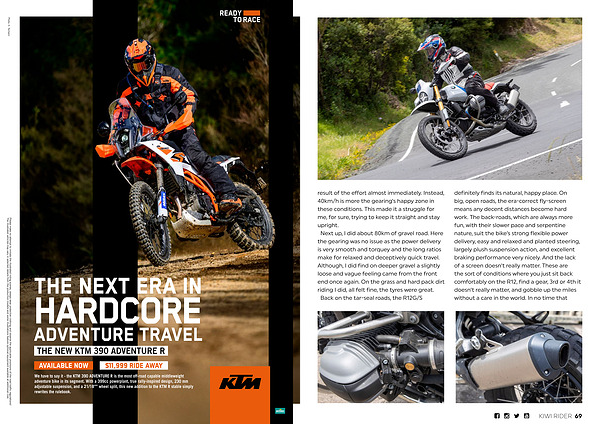 result of the effort almost immediately. Instead, 40km / h is more the gearing’ s happy zone in these conditions. This made it a struggle for me, for sure, trying to keep it straight and stay upright. Next up, I did about 80km of gravel road. Here the gearing was no issue as the power delivery is very smooth and torquey and the long ratios make for relaxed and deceptively quick travel. Although, I did find on deeper gravel a slightly loose and vague feeling came from the front end once again. On the grass and hard pack dirt riding I did, all felt fine, the tyres were great. Back on the tar-seal roads, the R12G / S