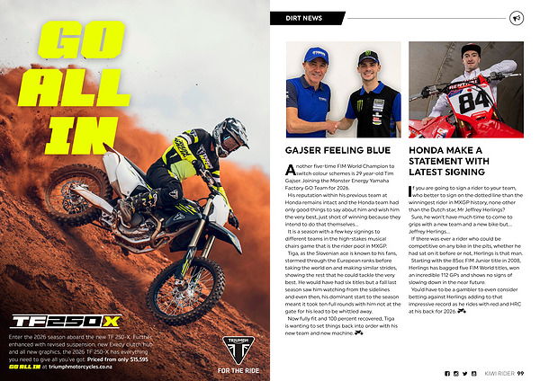 If you are going to sign a rider to your team, who better to sign on the dotted line than the winningest rider in MXGP history, none other than the Dutch star, Mr Jeffrey Herlings? Sure, he won’ t have much time to come to grips with a new team and a new bike but... Jeffrey Herlings... If there was ever a rider who could be competitive on any bike in the pits, whether he had sat on it before or not, Herlings is that man. Starting with the 85cc FIM Junior title in 2008, Herlings has bagged five FIM World titles, won an incredible 112 GPs and shows no signs of slowing down in the near future. You’ d have to be a gambler to even consider betting against Herlings adding to that impressive record as he rides with red and HRC at his back for 2026.