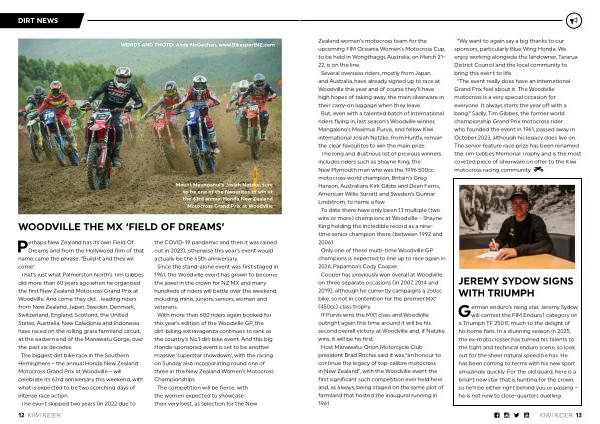 12 KIWI RIDER the COVID-19 pandemic and then it was rained out in 2023), otherwise this year’ s event would actually be the 65th anniversary. Since the stand-alone event was first staged in 1961, the Woodville event has grown to become the jewel in the crown for NZ MX and many hundreds of riders will battle over the weekend, including minis, juniors, seniors, women and veterans. With more than 600 riders again booked for this year’ s edition of the Woodville GP, the dirt-biking extravaganza continues to rank as the country’ s No. 1 dirt bike event. And this big Honda-sponsored event is set to be another massive‘ superstar showdown’, with the racing on Sunday also incorporating round one of three in the New Zealand Women’ s Motocross Championships. The competition will be fierce, with the women expected to showcase their very best, as selection for the New