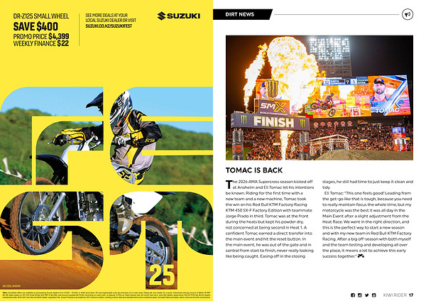 The 2026 AMA Supercross season kicked off at Anaheim and Eli Tomac let his intentions be known. Riding for the first time with a new team and a new machine, Tomac took the win on his Red Bull KTM Factory Racing KTM 450 SX-F Factory Edition with teammate Jorge Prado in third. Tomac was at the front during the heats but kept his powder dry, not concerned at being second in Heat 1. A confident Tomac earned a direct transfer into the main event and hit the reset button. In the main event, he was out of the gate and in control from start to finish, never really looking like being caught. Easing off in the closing stages, he still had time to just keep it clean and tidy. Eli Tomac:“ This one feels good! Leading from the get-go like that is tough, because you need to really maintain focus the whole time, but my motorcycle was the best it was all day in the Main Event after a slight adjustment from the Heat Race. We went in the right direction, and this is the perfect way to start a new season and with my new team in Red Bull KTM Factory Racing. After a big off-season with both myself and the team testing and developing all over the place, it means a lot to achieve this early success together.”