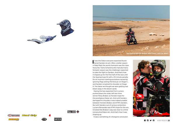 It was the Dakar everyone expected Aussie Daniel Sanders to win. After a stellar season in Rally Raid, the world champion was the clear favourite. Tosha Schareina who had also had a fantastic season was the challenger expected to take the fight to Sanders. And that’ s how it shaped up for the first half of the race until the Spaniard was hit with a 10-minute penalty for an incorrect starting procedure caused by ignoring flags exiting the bivouac on Stage 5... and Sanders smashed his shoulder on Stage 8. The Dakar we thought we were getting had blown away in the desert sands. Having the two expected front runners pushed down the order, left two-time winner Ricky Brabec as Honda’ s hope for the prestigious Dakar win. And until Sanders damaged his shoulder, it was indeed a battle between Honda’ s Brabec and KTM’ s Sanders. But with Sanders out of serious contention, Luciano Benavides was KTM’ s hope for the win. It looked like Brabec’ s way was clear to a third consecutive Dakar win. And that’ s how it was shaping up. It was a something of a foregone conclusion