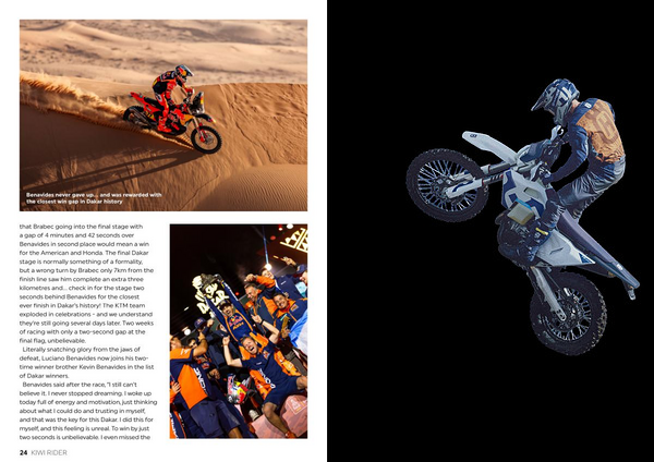 that Brabec going into the final stage with a gap of 4 minutes and 42 seconds over Benavides in second place would mean a win for the American and Honda. The final Dakar stage is normally something of a formality, but a wrong turn by Brabec only 7km from the finish line saw him complete an extra three kilometres and... check in for the stage two seconds behind Benavides for the closest ever finish in Dakar’ s history! The KTM team exploded in celebrations- and we understand they’ re still going several days later. Two weeks of racing with only a two-second gap at the final flag, unbelievable. Literally snatching glory from the jaws of defeat, Luciano Benavides now joins his twotime winner brother Kevin Benavides in the list of Dakar winners. Benavides said after the race,“ I still can’ t believe it. I never stopped dreaming. I woke up today full of energy and motivation, just thinking about what I could do and trusting in myself, and that was the key for this Dakar. I did this for myself, and this feeling is unreal. To win by just two seconds is unbelievable. I even missed the