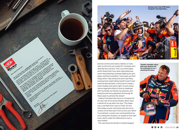 last two corners and nearly crashed, so it was right on the limit, but it paid off. I honestly can’ t describe this moment. This is my ninth Dakar, and it shows that if you never stop dreaming, never stop believing, and keep fighting for your goals, anything is possible. I never gave up. Even today, when I was losing time and I saw Ricky pushing hard, I kept telling myself it wasn’ t over until the last kilometre. In the end, he made a small mistake and I got it right. It’ s just unreal. Vamos Argentina! Now it’ s time to celebrate with my family, my friends, my sponsors, and everyone who has supported me through all these years to achieve this dream.” Clearly frustrated with the turn of events for his race, two-time winner Brabec didn’ t have a whole lot to say after the race,“ This Dakar was a real fight from start to finish. On the final stage, a quite confusing note led me to choose a line that wasn’ t the correct one. When I turned back, Luciano was coming behind me and, seeing the situation, he stayed on the right track, which made the difference in such a close battle.” Pre-race favourite Sanders showed dogged
