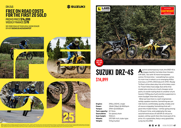 T & Cs: Suzukifest offers are available at participating Suzuki dealers from 1 / 11 / 25 – 31 / 1 / 26, or while stock lasts. Free on-road costs include Warrant of Fitness, six months registration, a full tank of fuel and Tyrewise fee.$ 69.57 / week based on DR-Z4S with RRP of $ 14,899, total amount payable $ 18,088.20, excluding on-road costs, nil deposit, 6.75 % p. a. fixed interest rate, 60-month loan term, total 260 weekly repayments, $ 10.35 PPSR fee, $ 0.50 weekly maintenance fee, $ 130 UDC loan fee and $ 200 dealer origination fee. Suzuki Finance is provided by UDC Finance Limited. Lending criteria, fees and standard terms and conditions apply. Excludes fleet purchases, demo units and all other promotions.