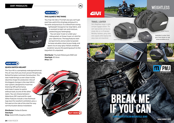 Distributor: Triumph Motorcycle( NZ) Ltd Size / style: 8.5 litres Price: $ 89