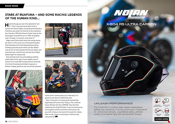 31 – Feb 1 and see none other than a certain Mr Aaron Slight, no doubt grinning like a Cheshire cat under his helmet as he unleashes the Yamaha YZR that Simon Crafar took to the Donington Grand Prix win in 1998. As Slighty said,“ It howls, it screams, and I love it!” Slight and Crafar both took the racing scene by storm in the same era, firmly planting the Kiwi footstep into that hallowed ground by showing just how quick Kiwis can be. Watch one of our all-time greats let his hair down and entertain you. And he has not lost that‘ Slight Advantage’ he always had. Also smiling hard-out and adding another exotic bike to his‘ yep, I have ridden one of those’ list is multi NZ Champ, Dennis Charlett, this time throwing( carefully) a leg over a Britten. Always great to see one of the planet’ s