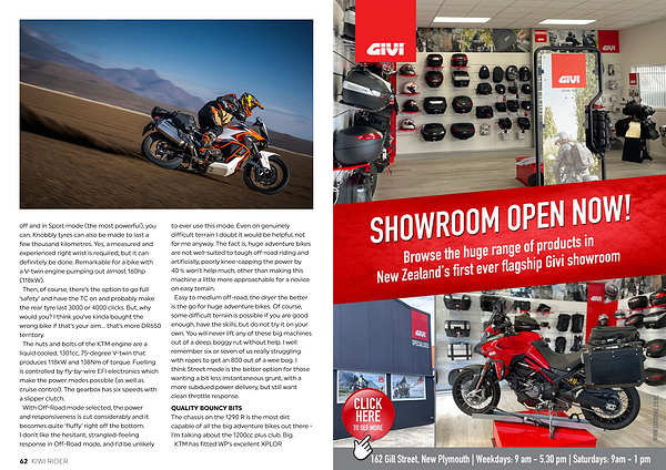 off and in Sport mode( the most powerful), you can. Knobbly tyres can also be made to last a few thousand kilometres. Yes, a measured and experienced right wrist is required, but it can definitely be done. Remarkable for a bike with a V-twin engine pumping out almost 160hp( 118kW). Then, of course, there’ s the option to go full‘ safety’ and have the TC on and probably make the rear tyre last 3000 or 4000 clicks. But, why would you? I think you’ ve kinda bought the wrong bike if that’ s your aim … that’ s more DR650 territory. The nuts and bolts of the KTM engine are a liquid cooled, 1301cc, 75-degree V-twin that produces 118kW and 138Nm of torque. Fuelling is controlled by fly-by-wire EFI electronics which make the power modes possible( as well as cruise control). The gearbox has six speeds with a slipper clutch. With Off-Road mode selected, the power and responsiveness is cut considerably and it becomes quite‘ fluffy’ right off the bottom. I don’ t like the hesitant, strangled-feeling response in Off-Road mode, and I’ d be unlikely