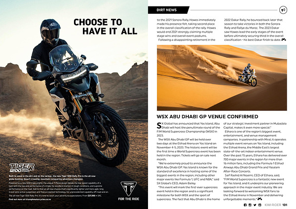 Powered by a new 1200 triple engine , the unique T-Plane design blends the low-speed capability of a twin with the top-end performance of a triple , for excellent traction in tough conditions , and supreme performance on the road . Add to that an all-new chassis that ’ s significantly lighter and more agile , long travel semi-active suspension and feature-packed technology , for unprecedented capability off-road and on . The all-new Tiger 1200 Rally Pro . It ’ s time to reset your adventure expectations . From $ 37,990 + ORC . Find out more at triumphmotorcycles . co . nz