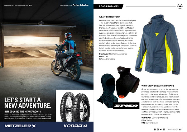 Great apparel can only go so far , sometimes you need a little extra to keep you warm and dry during the worst winter days . Spidi has a few tried and true products that riders swear on , such as a windproof thermal balaclava with a waterproof skirt ( no more rainwater coming off your helmet and going down your neck ) – they work , this writer has used one – or the wind-proof , breathable neck warmer , as seen on MotoGP tracks , which employs a snug fit to reduces drafts on the track or road .