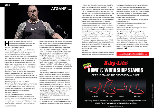 a 500km day . Normally , my mates and I head for roads that are joyfully free of the ATGANFI garbage . You might have to ride a bit further out , but that ’ s a small price to pay for cop-and-fool-free bitumen . But this Sunday was a little different due to Paul being with us , and we ended up on our way to Wollombi , which as any Sydney rider knows , is a very popular place to ride to on the weekend . As we approached the notorious Lemming Corner , we noticed a red roadwork traffic light , and three bikes . Two R1s and a Gixxer . All piped up and growling between the thighs of the most gloriously attired ATGANFIs ever . Their brand new top-shelf leathers , boots , gloves and helmets were just breathtaking , and my friends and I had lots of time to admire them , since the red light was taking its sweet time . Then it went green , and because I had a VMAX , The Door had a Rocket III , and Crew had a Speed Triple , we all raced the ATGANFIs to the first corner , and on towards the pub . Which is what happens on any Sunday . We won . Apparently , as Paul the L-plater told me when he got to the pub , being rounded up and bitched by smelly open-face helmet wearing , not-thinkingof-the-children scumbags on very large and stupid non-sports motorcycles apparently caused one of the ATGANFIs to take fright . So he crashed on the third corner after the red light at about 30km / h . Right in front of Paul , who was wobbling merrily along as L-platers do . “ Why did he fall off ,” Paul asked . “ It ’ s not like he was going very fast .” “ He fell off because he was a dickhead that couldn ’ t ride ,” I answered . “ But he had all that really nice gear . He looked like he could really bang .” “ Looks are deceiving ,” I shrugged . “ Those ATGANFI knob-smokers are like fake boobs . Fake boobs look sensational in dresses and sexy tops . But they are masters of deception . Get them naked and alone and they ’ re nothing but sad , misshapen fleshsacks of no integrity . They promise much , but deliver nothing and invariably disappoint with their performance . Just like the ATGANFIs .”