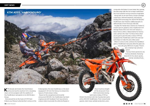 composite skid plate to even brake disc guards , the bike ships with the lot to help it withstand the most extreme racing scenarios imaginable . Along with an all-new frame , closed-cartridge suspension , refined bodywork , and industryleading TBI technology , the 2024 KTM 300 EXC HardEnduro also features additional parts to differentiate it from the base 300 EXC . Visually , the HardEnduro stands out , thanks to model-specific graphics and a traditional KTM Orange frame ( the 2024 300 EXC features a black frame ), while a ribbed diamante factory seat cushions the rider . For those times when you ’ ve got to give the bike a shove , KTM has equipped the HardEnduro with front and rear pull straps to make the job a little easier . When it comes to the controls , the handlebar gains a HardEnduro bar pad , while the grips are now soft , grey ODI lock-on grips . There ’ s also a handy map-selection switch . Factory frame protector set , Factory wheelset , featuring black D . I . D rims , black spokes , orange-anodised hubs ,