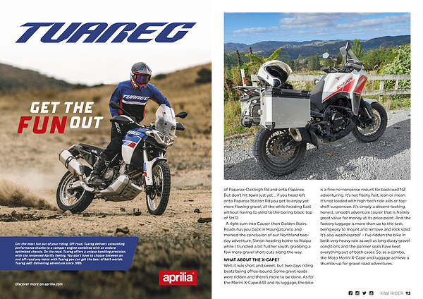 WHAT ABOUT THE X-CAPE ? Well , it was short and sweet , but two days riding beats being office-bound . Some great roads were ridden and there ’ s more to be done . As for the Morini X-Cape 649 and its luggage , the bike is a fine no-nonsense mount for backroad NZ adventuring . It ’ s not flashy , fast , lean or mean . It ’ s not loaded with high-tech ride aids or topshelf suspension . It ’ s simply a decent-looking , honest , smooth adventure tourer that is frankly great value for money at its price point . And the factory luggage is more than up to the task , being easy to mount and remove and rock solid . It ’ s also weatherproof – I ’ ve ridden the bike in both very heavy rain as well as long dusty gravel conditions and the pannier seals have kept everything out of both cases . So , as a combo , the Moto Morini X-Cape and luggage achieve a thumbs-up for gravel road adventures .