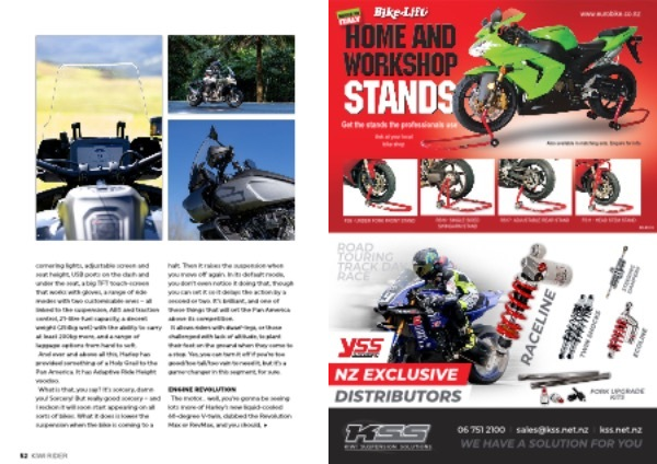 cornering lights , adjustable screen and seat height , USB ports on the dash and under the seat , a big TFT touch-screen that works with gloves , a range of ride modes with two customisable ones – all linked to the suspension , ABS and traction control , 21-litre fuel capacity , a decent weight ( 254kg wet ) with the ability to carry at least 200kg more , and a range of luggage options from hard to soft . And over and above all this , Harley has provided something of a Holy Grail to the Pan America . It has Adaptive Ride Height voodoo . What is that , you say ? It ’ s sorcery , damn you ! Sorcery ! But really good sorcery – and I reckon it will soon start appearing on all sorts of bikes . What it does is lower the suspension when the bike is coming to a halt . Then it raises the suspension when you move off again . In its default mode , you don ’ t even notice it doing that , though you can set it so it delays the action by a second or two . It ’ s brilliant , and one of those things that will set the Pan America above its competition . It allows riders with dwarf-legs , or those challenged with lack of altitude , to plant their feet on the ground when they come to a stop . Yes , you can turn it off if you ’ re too good / too tall / too vain to need it , but it ’ s a game-changer in this segment , for sure .