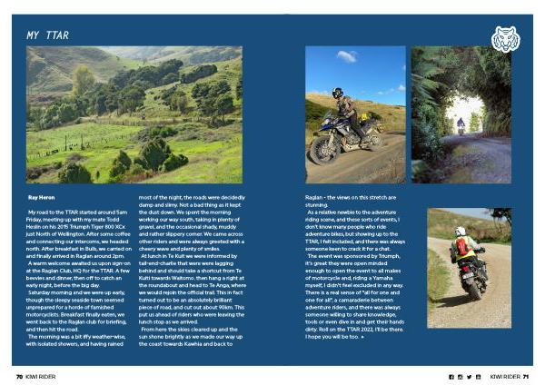 My road to the TTAR started around 5am Friday , meeting up with my mate Todd Heslin on his 2015 Triumph Tiger 800 XCx just North of Wellington . After some coffee and connecting our intercoms , we headed north . After breakfast in Bulls , we carried on and finally arrived in Raglan around 2pm . A warm welcome awaited us upon sign-on at the Raglan Club , HQ for the TTAR . A few bevvies and dinner , then off to catch an early night , before the big day . Saturday morning and we were up early , though the sleepy seaside town seemed unprepared for a horde of famished motorcyclists . Breakfast finally eaten , we went back to the Raglan club for briefing , and then hit the road . The morning was a bit iffy weather-wise , with isolated showers , and having rained most of the night , the roads were decidedly damp and slimy . Not a bad thing as it kept the dust down . We spent the morning working our way south , taking in plenty of gravel , and the occasional shady , muddy and rather slippery corner . We came across other riders and were always greeted with a cheery wave and plenty of smiles . At lunch in Te Kuit we were informed by tail-end-charlie that were were lagging behind and should take a shortcut from Te Kuiti towards Waitomo , then hang a right at the roundabout and head to Te Anga , where we would rejoin the official trail . This in fact turned out to be an absolutely brilliant piece of road , and cut out about 90km . This put us ahead of riders who were leaving the lunch stop as we arrived . From here the skies cleared up and the sun shone brightly as we made our way up the coast towards Kawhia and back to