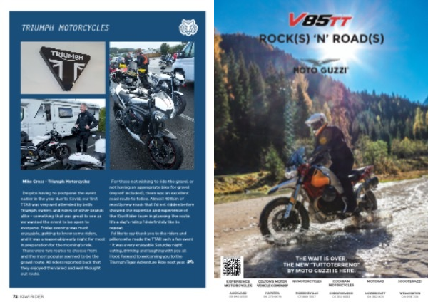 For those not wishing to ride the gravel , or not having an appropriate bike for gravel ( myself included ), there was an excellent road route to follow . Almost 400km of mostly new roads that I ’ d not ridden before showed the expertise and experience of the Kiwi Rider team in planning the route . It ’ s a day ’ s riding I ’ d definitely like to repeat . I ’ d like to say thank you to the riders and pillions who made the TTAR such a fun event - it was a very enjoyable Saturday night eating , drinking and laughing with you all . I look forward to welcoming you to the Triumph Tiger Adventure Ride next year .