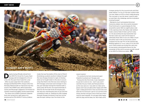 Despite being officially retired from the AMA Pro Circuit for X years , Ryan Dungey did not disappoint on his reentry into the sport that made him a star . After six years away from the outdoors , Dungey led Red Bull KTM ’ s charge at the Fox Raceway National with an impressive top-five result in the 450MX class , while teammates Cairoli and Plessinger swapped 6-10 finishes for seventh overall and eighth overall , respectively . The three-time 450MX Champion stepped back into racing form right away as he positioned his KTM 450SX-F Factory Edition inside the top-five battle off the start of Moto1 . Overtaking a podium position midway through the race , Dungey showed no signs of slowing down as he fought down to the wire to secure a top-five finish in his first race since retiring in 2017 . Dungey came back even stronger in race two , just narrowly missing the holeshot with a quick jump off the line . He raced assertively in third for the first half of the 30 minutes plus two-lap race , matching the pace of his full-time competitors early on . Settling into fifth midway through , Dungey remained in top form all the way through , sealing a top-five result at the