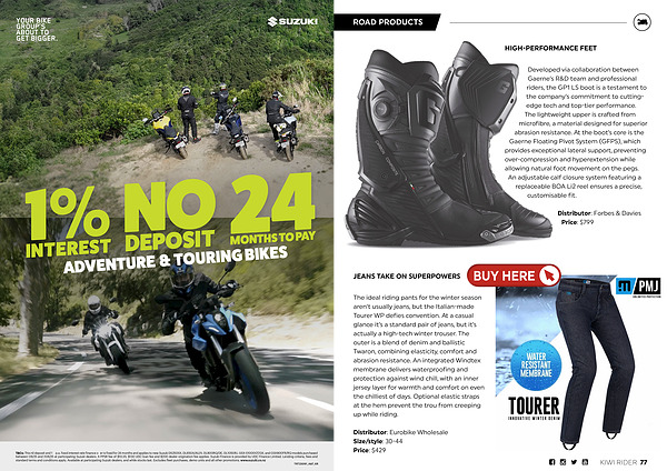 T & Cs: This nil deposit and 1 % p. a. fixed interest rate finance offer is fixed for 24 months and applies to new Suzuki DS250SX, DL650A / AU / X, DL800RQ / DE, DL1050RJ, GSX-S1000GT / GX, and GSX800FR / RQ models purchased between 1 / 6 / 25 and 31 / 6 / 25 at participating Suzuki dealers. A PPSR fee of $ 10.35, $ 130 UDC loan fee and $ 200 dealer origination fee applies. Suzuki Finance is provided by UDC Finance Limited. Lending criteria, fees and standard terms and conditions apply. Available at participating Suzuki dealers, and while stocks last. Excludes fleet purchases, demo units and all other promotions. www. suzuki. co. nz