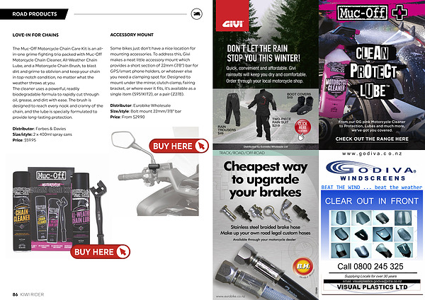 The Muc-Off Motorcycle Chain Care Kit is an allin-one grime fighting trio packed with Muc-Off Motorcycle Chain Cleaner, All-Weather Chain Lube, and a Motorcycle Chain Brush, to blast dirt and grime to oblivion and keep your chain in top-notch condition, no matter what the weather throws at you. The cleaner uses a powerful, readily biodegradable formula to rapidly cut through oil, grease, and dirt with ease. The brush is designed to reach every nook and cranny of the chain, and the lube is specially formulated to provide long-lasting protection.