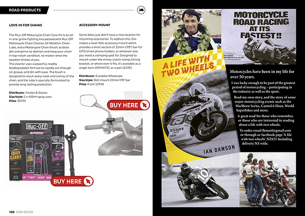 To order email fkmnzl @ gmail. com or through or facebook page‘ A life with two wheels’. NZ $ 55 Including delivery NZ wide.