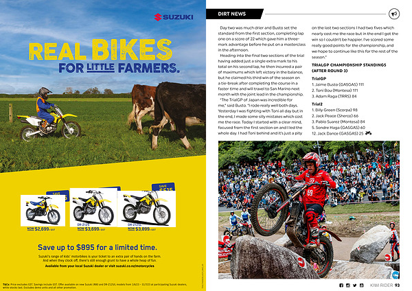 Day two was much drier and Busto set the standard from the first section , completing lap one on a score of 22 which gave him a threemark advantage before he put on a masterclass in the afternoon . Heading into the final two sections of the trial having added just a single extra mark to his total on his second lap , he then incurred a pair of maximums which left victory in the balance , but he claimed his third win of the season on a tie-break after completing the course in a faster time and will travel to San Marino next month with the joint lead in the championship . “ The TrialGP of Japan was incredible for me ,” said Busto . “ I rode really well both days . Yesterday I was fighting with Toni all day but in the end , I made some silly mistakes which cost me the race . Today I started with a clear mind , focused from the first section on and I led the whole day . I had Toni behind and it ’ s just a pity on the last two sections I had two fives which nearly cost me the race but in the end I got the win so I couldn ’ t be happier . I ’ ve scored some really good points for the championship , and we hope to continue like this for the rest of the season .”