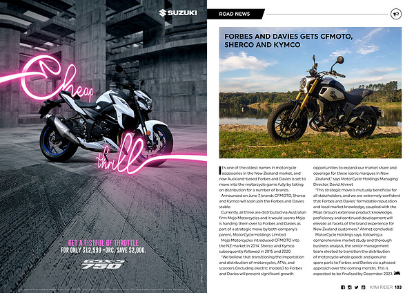 It ’ s one of the oldest names in motorcycle accessories in the New Zealand market , and now Auckland-based Forbes and Davies is set to move into the motorcycle game fully by taking on distribution for a number of brands . Announced on June 7 , brands CFMOTO , Sherco and Kymco will soon join the Forbes and Davies stable . Currently , all three are distributed via Australian firm Mojo Motorcycles and it would seems Mojo is handing them over to Forbes and Davies as part of a strategic move by both company ’ s parent , MotorCycle Holdings Limited . Mojo Motorcycles introduced CFMOTO into the NZ market in 2014 . Sherco and Kymco subsequently followed in 2015 and 2020 . “ We believe that transitioning the importation and distribution of motorcycles , ATVs , and scooters ( including electric models ) to Forbes and Davies will present significant growth opportunities to expand our market share and coverage for these iconic marques in New Zealand ,” says MotorCycle Holdings Managing Director , David Ahmet “ This strategic move is mutually beneficial for all stakeholders , and we are extremely confident that Forbes and Davies ’ formidable reputation and local market knowledge , coupled with the Mojo Group ’ s extensive product knowledge , proficiency and continued development will elevate all facets of the brand experience for New Zealand customers .” Ahmet concluded . MotorCycle Holdings says , following a comprehensive market study and thorough business analysis , the senior management team elected to transition the distribution of motorcycle whole goods and genuine spare parts to Forbes and Davies via a phased approach over the coming months . This is expected to be finalised by December 2023 .