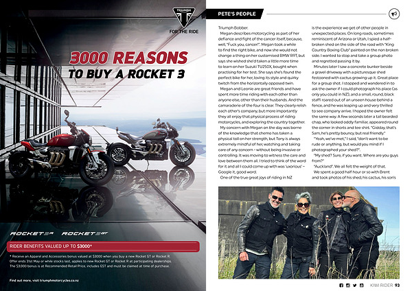 Triumph Bobber . Megan describes motorcycling as part of her defiance and fight of the cancer itself , because , well , “ Fuck you , cancer !”. Megan took a while to find the right bike , and now she would not change a thing on her customised BMW R9T , but says she wished she ’ d taken a little more time to learn on her Suzuki TU250X , bought when practising for her test . She says she ’ s found the perfect bike for her , loving its style and quirky twitch from the horizontally opposed twin . Megan and Leonie are great friends and have spent more time riding with each other than anyone else , other than their husbands . And the camaraderie of the four is clear . They clearly relish each other ’ s company , but more importantly they all enjoy that physical process of riding motorcycles , and exploring the country together . My concern with Megan on the day was borne of the knowledge that chemo has taken a physical toll on her strength , but Tony is always extremely mindful of her , watching and taking care of any concern - without being invasive or controlling . It was moving to witness the care and love between them all . I tried to think of the word for it and all I could come up with was ‘ uxorious ’ – Google it , good word . One of the true great joys of riding in NZ is the experience we get of other people in unexpected places . On long roads , sometimes reminiscent of Arizona or Utah , I spied a halfbroken shed on the side of the road with “ King Country Boxing Club ” painted on the non broken side . I wanted to stop and take a group photo and regretted passing it by . Minutes later I saw a concrete bunker beside a gravel driveway with a picturesque shed festooned with cactus growing up it . Great place for a group shot . I stopped and wandered in to ask the owner if I could photograph his place ( as only you could in NZ ), and a small , round , black staffi roared out of an unseen house behind a fence , and he was leaping up and very thrilled to see company arrive . I hoped the owner felt the same way . A few seconds later a tall bearded chap , who looked oddly familiar , appeared round the corner in shorts and tee shirt . “ Gidday , that ’ s Sam , he ’ s pretty bouncy , but real friendly .” “ Yeah , we ’ ve met ,” I said , “ don ’ t want to be rude or anything , but would you mind if I photographed your shed ?”. “ My shed ? Sure , if you want . Where are you guys from ?” “ Auckland ”. We all felt the weight of that . We spent a good half hour or so with Brent and took photos of his shed , his cactus , his son ’ s