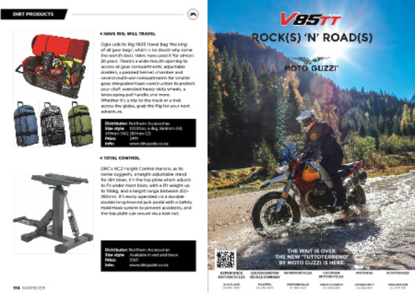 EXPERIENCE MOTORCYCLES AUCKLAND 09 845 5950 COLTON ’ S MOTOR VEHICLE COMPANY HAWERA 06 278 6676 NV MOTORCYCLES MORRINSVILLE 07 889 1007 COCKRAM MOTORCYCLES CHRISTCHURCH 03 353 6383 MOTORAD LOWER HUTT 04 382 8011 SCOOTERAZZI WELLINGTON 04 978 738 THE WAIT IS OVER . THE NEW “ TUTTOTERRENO ” BY MOTO GUZZI IS HERE . MOTOGUZZI . COM