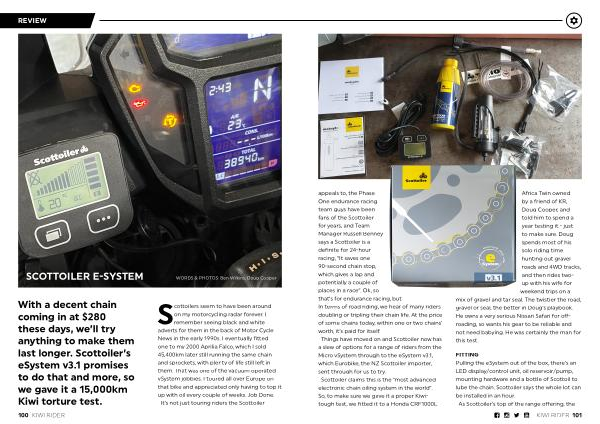 appeals to , the Phase One endurance racing team guys have been fans of the Scottoiler for years , and Team Manager Russell Benney says a Scottoiler is a definite for 24-hour racing , “ It saves one 90-second chain stop , which gives a lap and potentially a couple of places in a race ”. Ok , so that ’ s for endurance racing , but In terms of road riding , we hear of many riders doubling or tripling their chain life . At the price of some chains today , within one or two chains ’ worth , it ’ s paid for itself . Things have moved on and Scottoiler now has a slew of options for a range of riders from the Micro vSystem through to the eSystem v3.1 , which Eurobike , the NZ Scottoiler importer , sent through for us to try . Scottoiler claims this is the “ most advanced electronic chain oiling system in the world ”. So , to make sure we gave it a proper Kiwitough test , we fitted it to a Honda CRF1000L