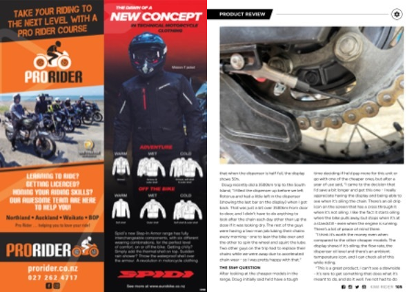 that when the dispenser is half full , the display shows 50 %. Doug recently did a 3500km trip to the South Island , “ I filled the dispenser up before we left Rotorua and had a little left in the dispenser ( showing the last bar on the display ) when I got back . That was just a bit over 3500km from door to door , and I didn ’ t have to do anything to look after the chain each day other than up the dose if it was looking dry . The rest of the guys were having a two-man job lubing their chains every morning - one to lean the bike over and the other to spin the wheel and squirt the lube . Two other guys on the trip had to replace their chains while we were away due to accelerated chain wear - so I was pretty happy with that .”