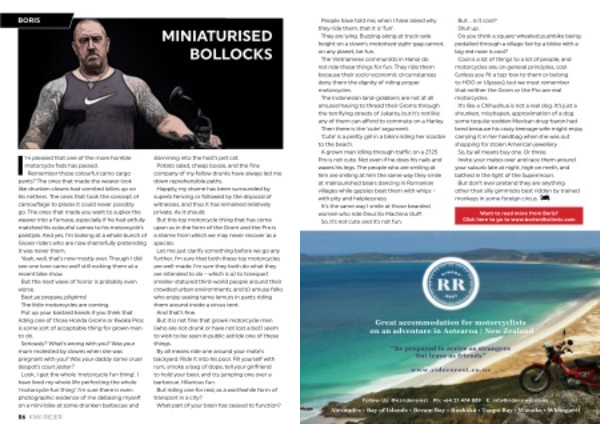 ’ m pleased that one of the more horrible motorcycle fads has passed . Remember those colourful camo cargo pants ? The ones that made the wearer look like drunken clowns had vomited lollies up on his nethers . The ones that took the concept of camouflage to places it could never possibly go . The ones that made you want to suplex the wearer into a furnace , especially if he had artfully matched his colourful camos to his motorcycle ’ s paintjob . And yes , I ’ m looking at a whole bunch of Gixxer riders who are now shamefully pretending it was never them . Yeah , well , that ’ s now mostly over . Though I did see one lone camo wolf still rocking them at a recent bike show . But the next wave of horror is probably even worse . Best ye prepare , pilgrims ! The little motorcycles are coming . Put up your bastard hands if you think that riding one of those Honda Groms or Kwaka Pros is some sort of acceptable thing for grown men to do . Seriously ? What ’ s wrong with you ? Was your mum molested by clowns when she was pregnant with you ? Was your daddy some cruel despot ’ s court jester ? Look , I get the whole ‘ motorcycle fun thing ’. I have lived my whole life perfecting the whole ‘ motorcycle fun thing ’. I ’ m sure there is even photographic evidence of me debasing myself on a mini-bike at some drunken barbecue and slamming into the host ’ s pet cat . Potato salad , cheap booze , and the fine company of my fellow drunks have always led me down reprehensible paths . Happily , my shame has been surrounded by superb fencing or followed by the disposal of witnesses , and thus it has remained relatively private . As it should . But this toy motorcycle thing that has come upon us in the form of the Grom and the Pro is a shame from which we may never recover as a species . Let me just clarify something before we go any further . I ’ m sure that both these toy motorcycles are well-made . I ’ m sure they both do what they are intended to do – which is a ) to transport smaller-statured third-world people around their crowded urban environments ; and b ) amuse folks who enjoy seeing tame lemurs in pants riding them around inside a circus tent . And that ’ s fine . But it is not fine that grown motorcycle men ( who are not drunk or have not lost a bet ) seem to wish to be seen in public astride one of these things . By all means ride one around your mate ’ s backyard . Ride it into his pool . Fill yourself with rum , smoke a bag of dope , tell your girlfriend to hold your beer , and try jumping one over a barbecue . Hilarious fun . But riding one for real , as a worthwhile form of transport in a city ? What part of your brain has ceased to function ?