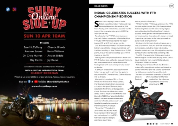 Motorcycle Vice President . “ While the 2022 FTR lineup optimises the FTR ’ s on-road performance , the FTR Championship Edition reignites our flat track racing legacy and celebrates the Wrecking Crew ’ s historic success . Although this limited-edition bike is a commemorative show piece , it ’ s also an on-road ripper that performs in the twisties as well as turns heads on city streets .” Adding to its flat track-inspired design are a host of premium features and ride-enhancing technologies , including three ride modes , wheelie control with rear lift mitigation , stability control , traction control and cornering ABS . The FTR Championship Edition also touts a 110mm digital touchscreen display and a 1203cc liquid-cooled V-twin engine that produces 123hp and 120Nm of torque . Radially mounted dual front disc Brembo brakes offer exceptional control and stopping power , while ProTaper flat tracker aluminium handlebars complete the race bike look . No word on how many examples of the 400 bikes on offer are slated for the New Zealand market , but the bikes are expected to arrive here around June .