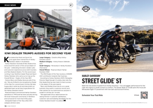 Kiwi dealership Road and Sport has once again been named the # 1 Harley- Davidson dealer in Australasia . Harley-Davidson Australia & New Zealand has announced the winner of the annual dealer of the year - celebrating the best in dealer sales and customer experience across both Australia and New Zealand dealers . For the second year running , it was Hamilton dealer Road and Sport Harley-Davidson who came out on top as the Overall Winner - Dealer of the Year 2021 . Owners Barry and Shelley Sproule said of the win , “ We are thrilled to be recognised as Dealer of the Year for a second year running . We take huge pride in what we do and along with our dedicated team we all have huge passion for the Harley-Davidson brand .” Road and Sport commenced Harley-Davidson operations in 1990 and has been proudly serving the local motorcycle community in Hamilton and surrounds for more than thirty years . Alongside Dealer of the Year , other 2021 category winners were :
