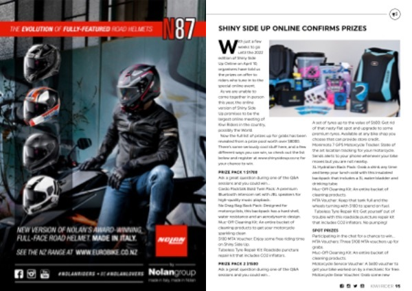 With just a few weeks to go until the 2022 edition of Shiny Side Up Online on April 10 , organisers have told us the prizes on offer to riders who tune in to the special online event . As we are unable to come together in person this year , the online version of Shiny Side Up promises to be the largest online meeting of Kiwi Riders in the country , possibly the World . Now the full list of prizes up for grabs has been revealed from a prize pool worth over $ 8000 . There ’ s some seriously cool stuff here , and a few different ways you can win , so check out the list below and register at www . shinysideup . co . nz for your chance to win .