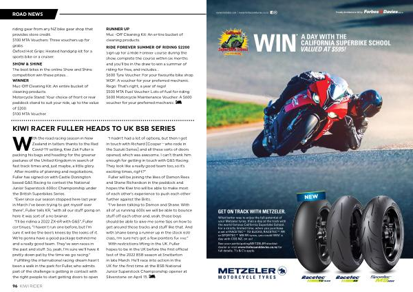 “ I hadn ’ t had a lot of options , but then I got in touch with Richard [ Cooper - who rode in the Suzuki Series ] and all these sorts of doors opened , which was awesome . I can ’ t thank him enough for getting in touch with G & S Racing . They look like a really good team too , so it ’ s exciting times , right ?” Fuller will be joining the likes of Damon Rees and Shane Richardson in the paddock and hopes the Kiwi trio will be able to make most of each other ’ s experience to push each other further against the Brits . “ I ’ ve been talking to Damon and Shane . With all of us running 600s we will be able to bounce stuff off each other and , yeah , those boys should be able to give me some tips on how to get around those tracks and stuff like that . And with Shane being a runner up in the stock 600 class , I ’ m sure he ’ s got a few pointers for me .” With restrictions lifting in the UK , Fuller hopes to be in the UK before the first official test of the 2022 BSB season at Snetterton in late March . He ’ ll race into action in the UK for the first time at the BSB National Junior Superstock Championship opener at Silverstone on April 15 .
